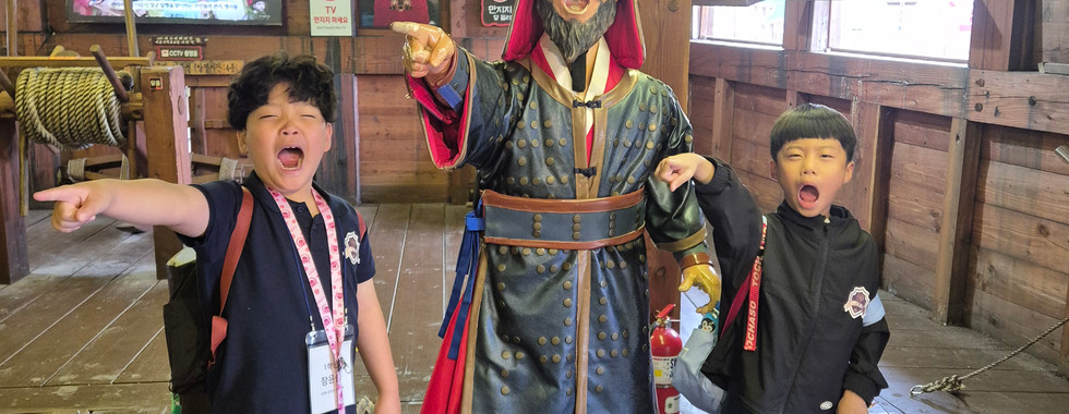 오후에는 진남관으로 출발했습니다! 그곳에서 나라를 지키기 위해 싸웠던 선조들의 이야기를 들을 수 있었습니다. 이후 이순신 광장에서 거북선을 구경하며 즐거운 시간을 보냈습니다.